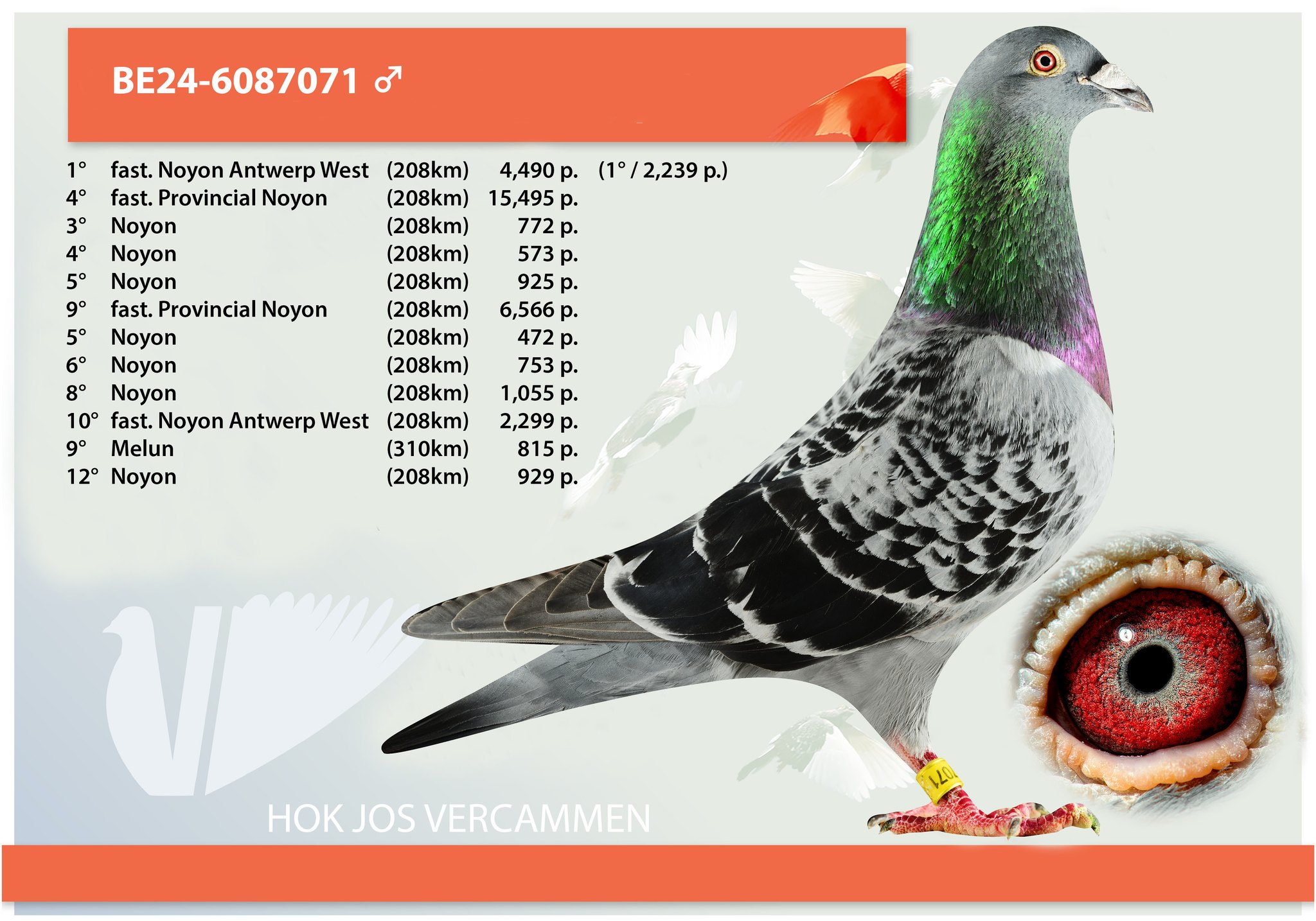Забудьте на секунду о родословных и дорогих документах. Саган был настоящим спортсменом. Белоглазый голубь с пронзительным взглядом. В 2013 году, будучи годовалым, он совершил немыслимое. Он стал первым национальным асом спринта в KBDB с коэффициентом всего 1,87%. Он победил опытных гонщиков, будучи еще совсем молодым. Он доминировал из Нойона, гонки, где одной лишь скорости недостаточно; для выживания необходимы «тело» и ориентация.