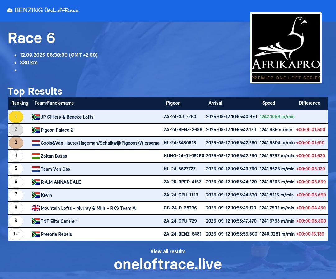Ирвинг Ван Осс неудержим! После отличного сезона в Нидерландах его голуби теперь блистают на международной арене. На этот раз в AFRIKAPRO , где он лидирует в соревновании Blue Jacket — престижной битве за звание лучшего голубя-аса во всех гонках.
