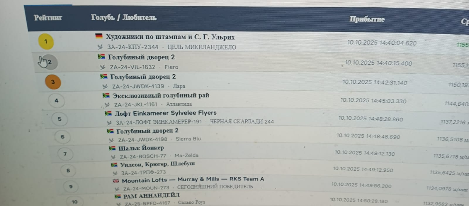 Победитель из Германии,а призеры из ЮАР.Что любопытно,родовые кольца голубей- ZA(Южная Африка).