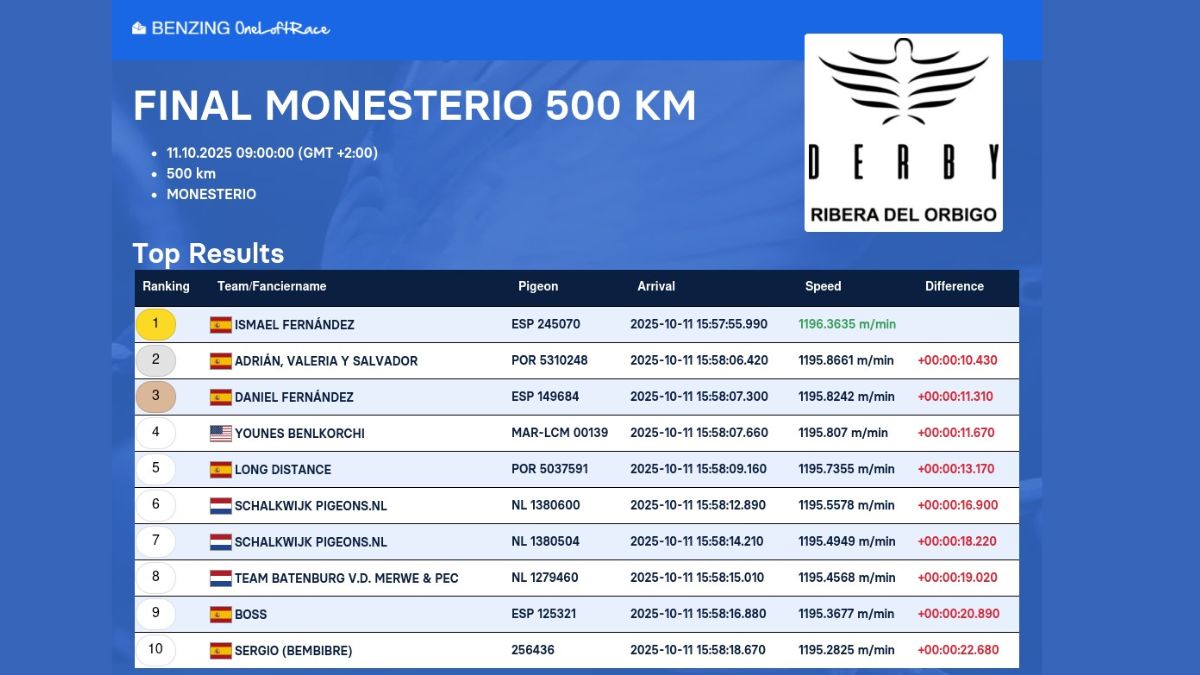 Финальня гонка на 500 км в Монестерио в рамках Дерби Рибера-дель-Орбиго 2025 стартовалА 11 октября в 09:00 из Монестерио. Классическое 500-километровое испытание проходило в идеальных условиях — при ясном небе, лёгком встречном ветре и при жёсткой конкуренции со всей Европы. С участием любителей из Испании, Португалии, Нидерландов, Марокко и других стран… гонка быстро превратилась в скоростную битву, где всё решалось буквально за секунды. Победитель, Исмаэль Фернандес (ESP 245070), показал время 1196,36 м/мин, опередив Адриана, Валерию-и-Сальвадор и Даниэля Фернандеса.