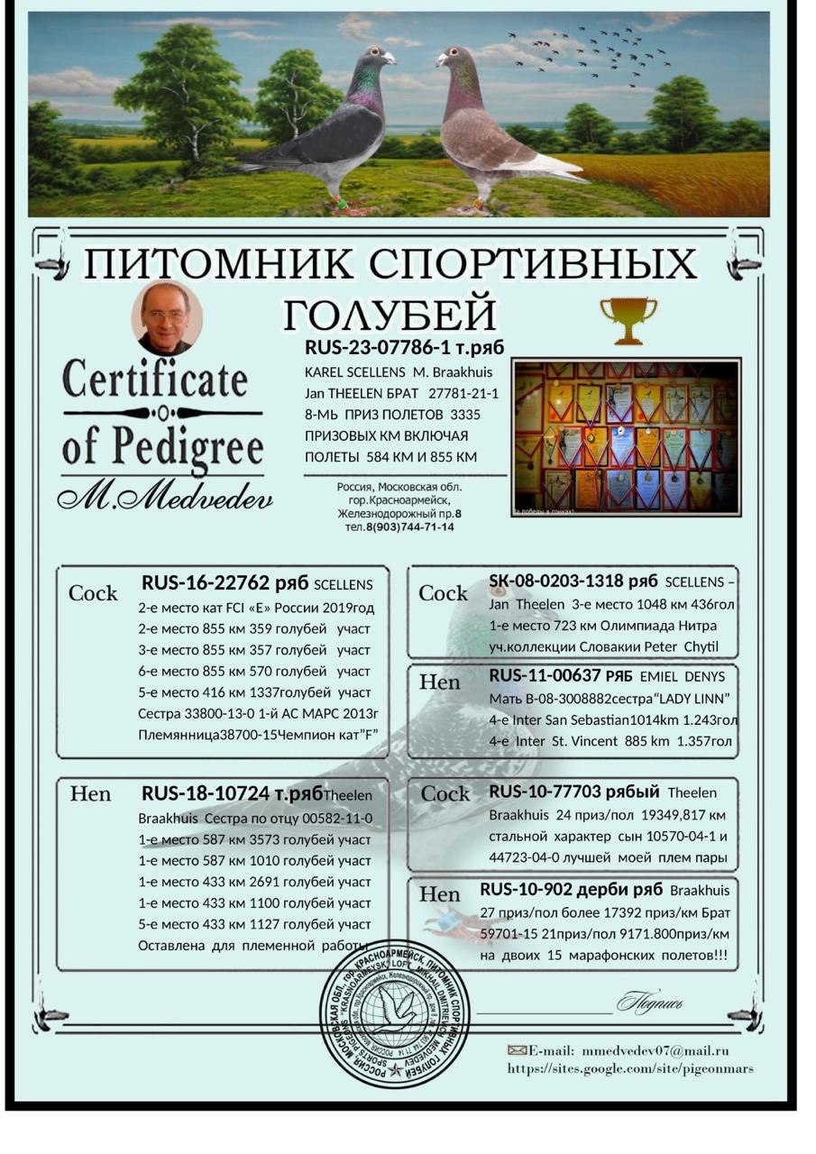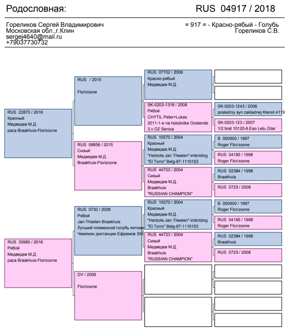 Мне прислали, например, там есть вроде бы и от Вашего питомника родословные, по крайней мере, Ваше фото там в кружочке, тоже звеньев маловато. Отец там rus-12-55510 тем. рябой. Мать rus-20-18213 сизая. Это слева два квадратика, а справа 4 квадратика с информацией, в них больше о заграничных гонках, призах, и всё. Причём, у двух голубей эти родители, они оба 24 года, голубь и голубка, годовики, видимо, летали на Марсе в прошлом году, АС голуби. И если родители одни и те же, значит это одногнездки должны быть? Но кольца у них не рядом по числам? Вроде бы должны быть, допустим, у одного 2515, а у другого 2514 или 2513? А там не так - 23202 у голубки, а у голубя - 23249? Прислать бы Вам куда-то, чтоб Вы глянули? Там вот телефон на родословной, с кодом 903, это рабочий телефон? На него можно выслать снимки родословных?